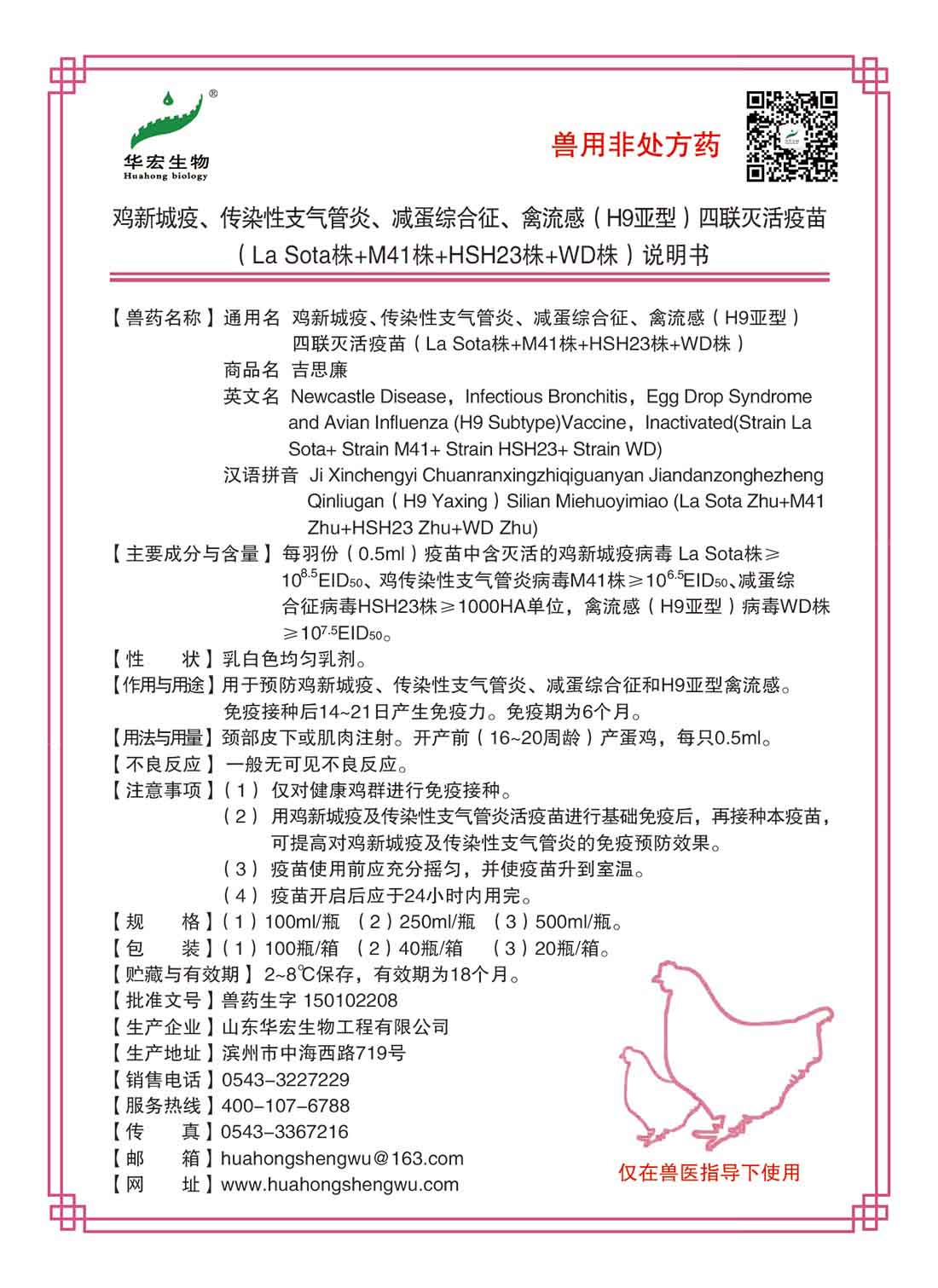 雞新城疫、傳染性支氣管炎、減蛋綜合征、禽流感(H9亞)四聯(lián)滅活疫苗